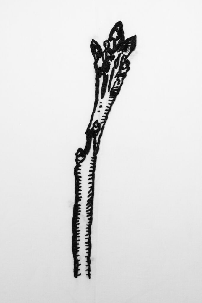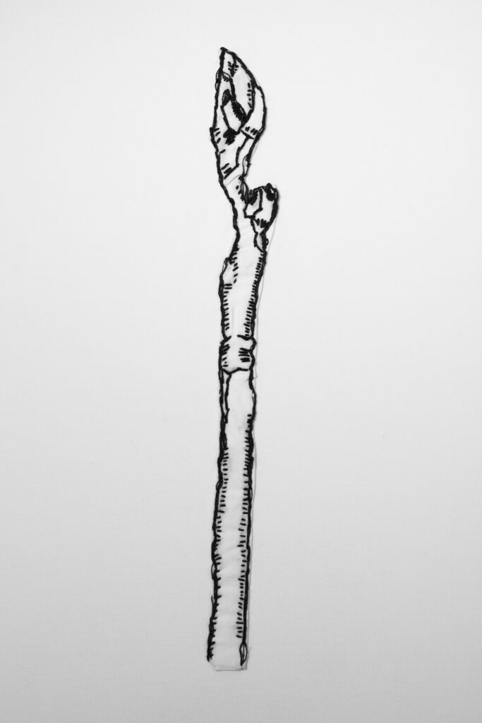 These embroideries are a selection of winter tree twigs from Ontario trees. I chose to depict the twigs in their dormancy; a state of minimal activity that protects the tree though harsh weather conditions. This suspended state rendered simply in black and white, suggests vulnerability as well as a quiet resilience.